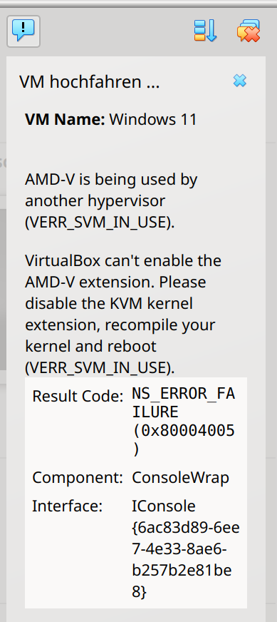 Versucht man VirtualBox mit aktivem KVM Kernelmodul zu starten erscheint folgende Meldung: